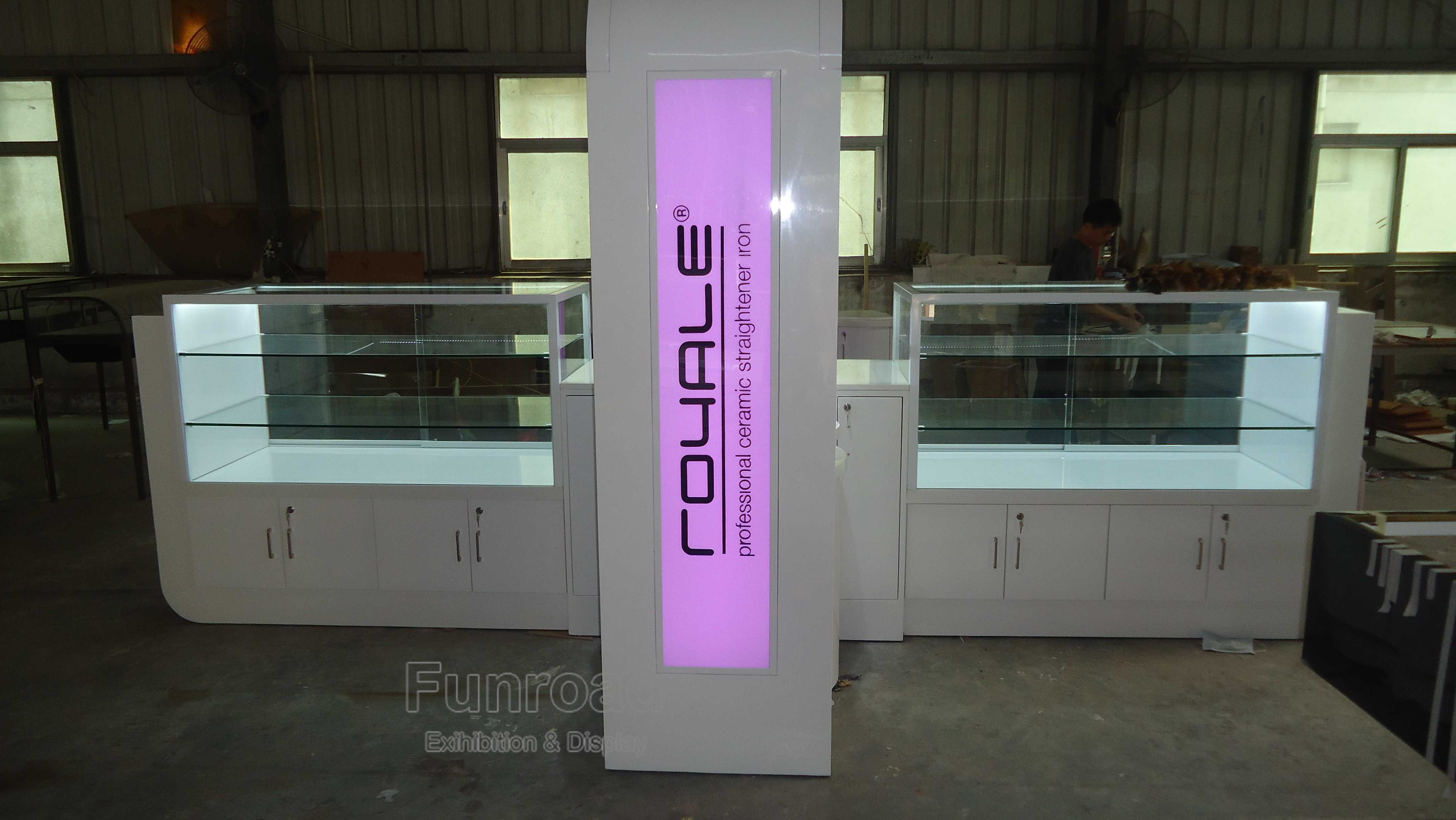在美國做生意的MR李找到我們,要我們為設計制作適合商場環境的產品銷售柜臺。通過與客戶的溝通,明確了需要展示的產品類型,商場面積位置構造,再結合客戶的需求,我們進行了專業化的設計。現這款精美的商場化妝品展柜現已設計制作完成,下面我們一起來看這款精美的商場展柜吧。
