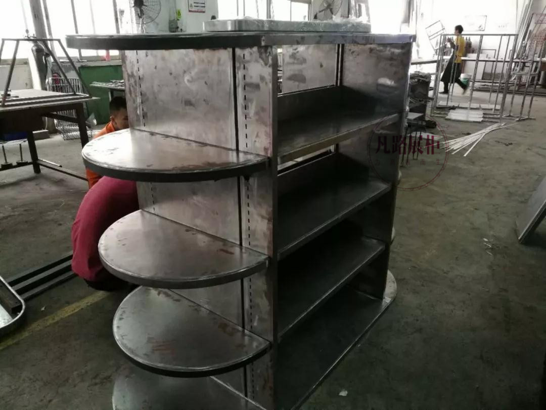 上圖:弧形高低展示組合柜,5800*800*3750米,總重量4000kg,主材:鐵板+橡木木皮+黑色杜邦人造石+LED燈條