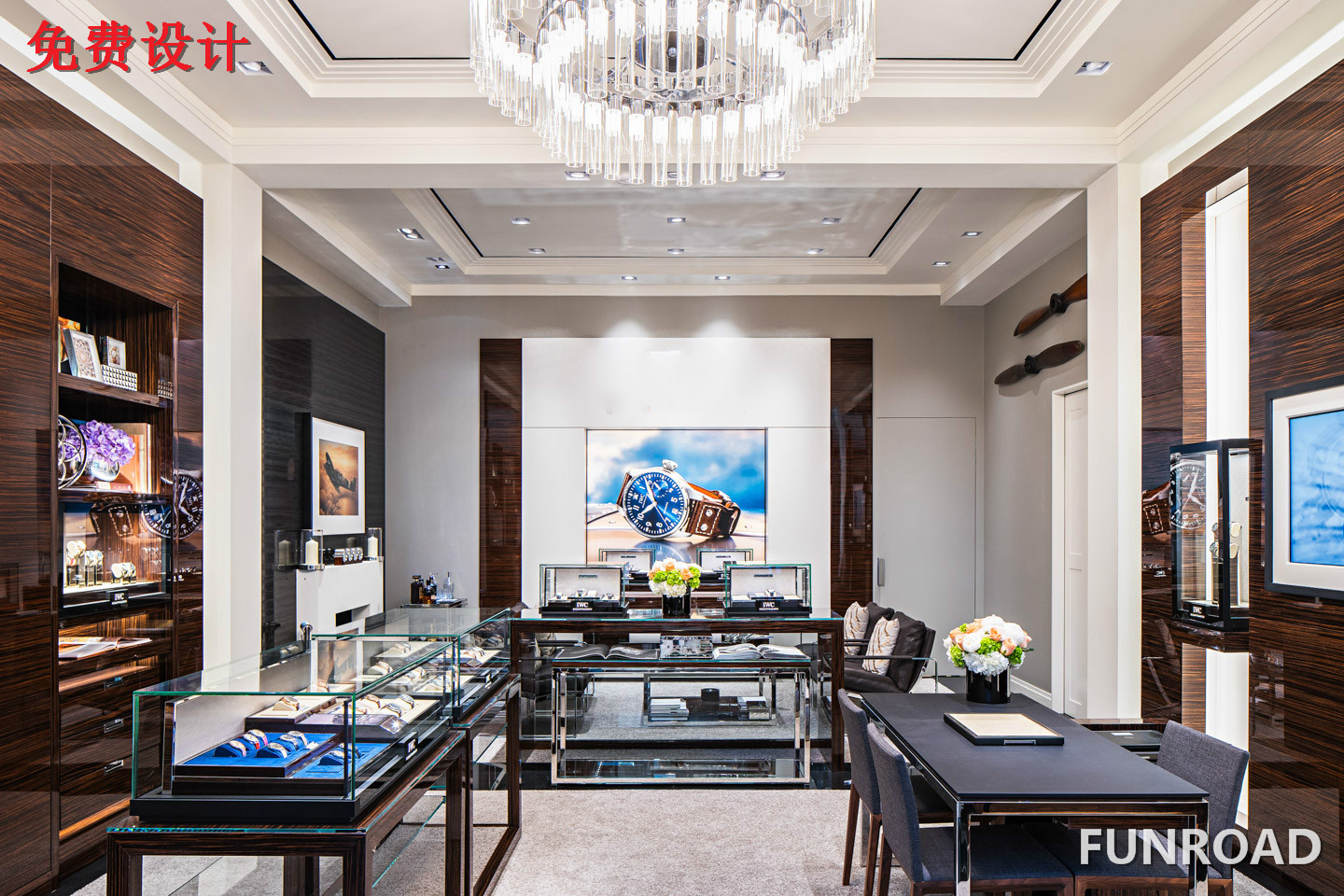 【產品名稱】:品牌手表店,木質烤漆手表展示柜臺設計案例